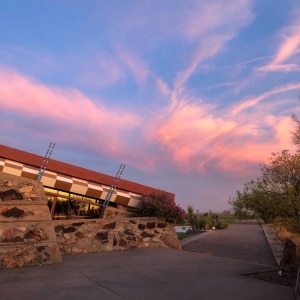 A serene evening view at Taliesin West with a pink and blue sunset sky above a building with a distinctive red-tiled roof and stone walls, flanked by native desert vegetation and a paved pathway leading to the structure.