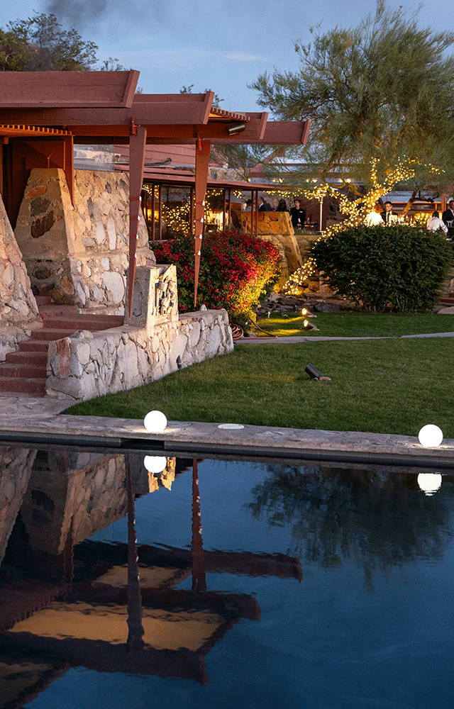 Evening gathering for a corporate event, light reflected in the pool at Taliesin West
