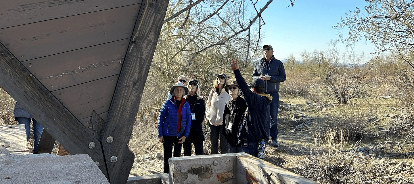 A group of visitors on the Shelters in the Desert Shelter Hike approaching a structure where one ofthe Apprentices lived at Taliesin West to learn about its history.