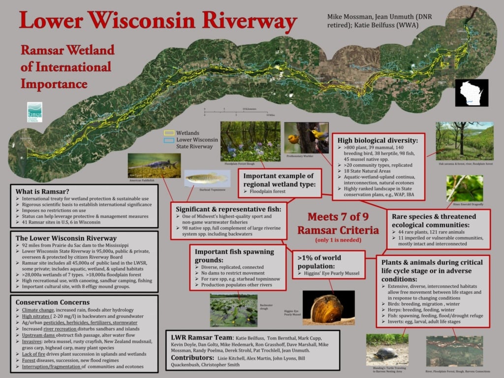Why is the Lower Wisconsin Riverway (LWR) Ramsar site so significant? At least one of nine criteria must be fulfilled in order to gain this status, and the fact that seven of nine criteria were met shows just how significant the site. Background data and analyses were used to support the criteria, including the Wisconsin Department of Natural Resources 2016 LWR Master Plan, Important Bird Area studies, and the Wisconsin River Action Plan. The site includes more than 28,000 acres of wetlands and some adjacent uplands which provides interconnected habitats for mammals, birds, turtles, frogs, and insects to move freely between land and water. This is especially important for many animals during certain life stages like breeding, rearing young or overwintering. The Ramsar site is high in biological diversity with more than 800 plants, 39 mammals, 140 birds, and 38 herptiles. There are many rare and threatened ecological communities, 44 rare plants, and 121 rare animals.